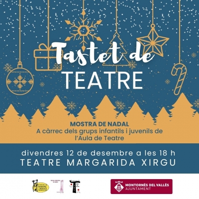 Tastet de Teatre 2025 Dia i hora: divendres 12/12/2025 a les 18:00h Lloc: Teatre Margarida Xirgu Organitza: Escola Municipal de Música, Dansa i Aula de Teatre Enguany diversos grups de teatre de l'Escola participaran en aquest tastet de teatre. Properament tindreu més informació sobre aquesta activitat.