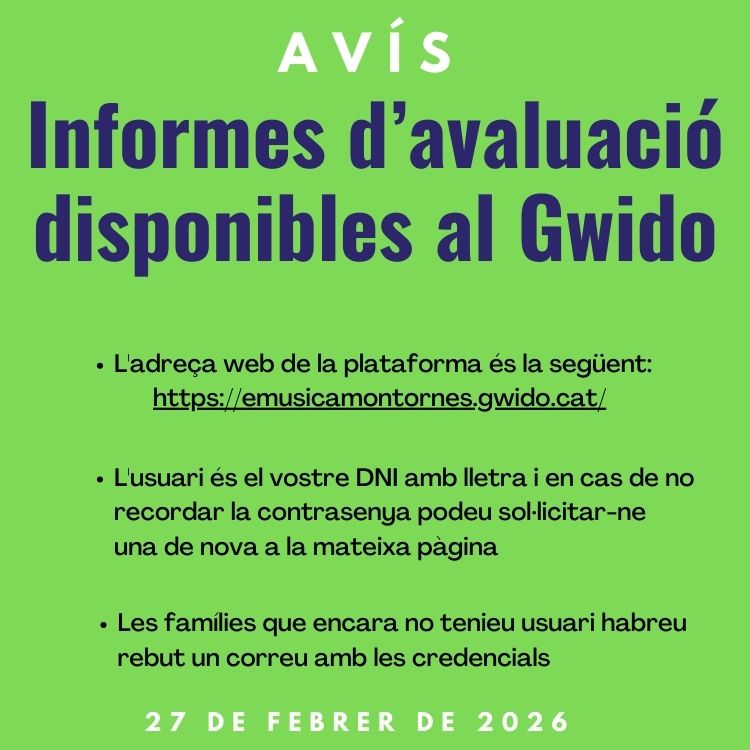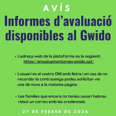 Per accedir als informes, ho heu de fer a través de la plataforma GWIDO. L'adreça web de la plataforma és la següent: https://emusicamontornes.gwido.cat/